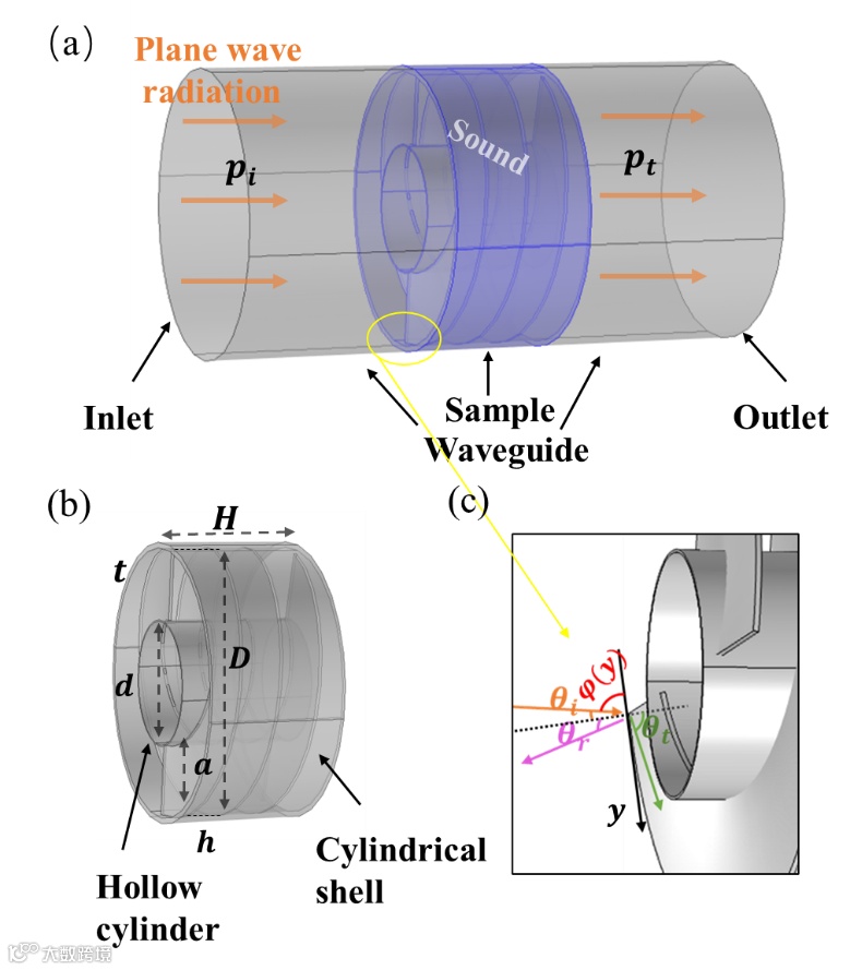 图2所示为螺旋吸声器的模型。(a)将螺旋单元置于波导中;(b)螺旋装置的内部结构;(c)声波在螺旋单元入口处的波传输行为反/折射示意图。