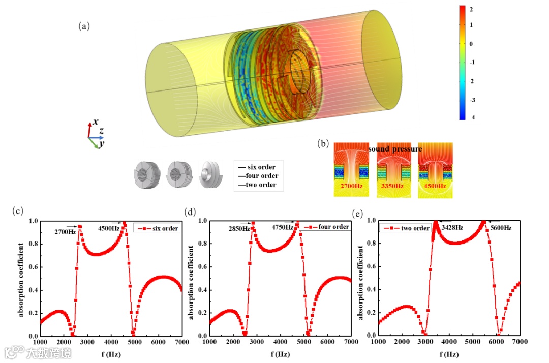 图4所示。不同螺旋路径阶数对吸收系数的影响。(a) 2、4、6级螺旋的模型图;(b)6阶螺旋在2.7 kHz、3.35 kHz及4.5 kHz声压及速度分布剖视图;(c)-(e)这三个不同阶次单元的水下吸声曲线。