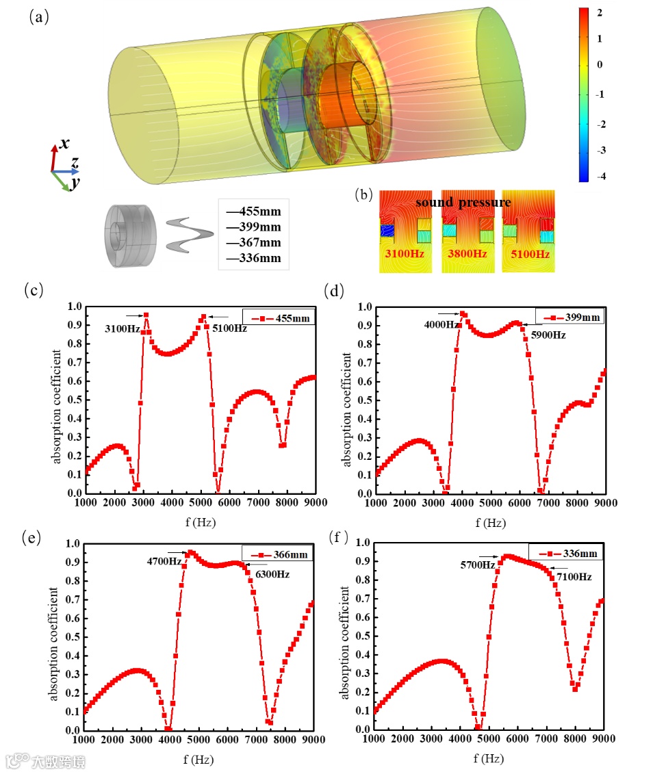 图3为不同螺旋长度对吸收系数的影响。(a)有限元计算模型示意图;(b)长度为455mm的螺旋单元在3.1 kHz、3.8 kHz和5.1 kHz处的声压和速度分布截面。颜色表示声压分布,白色线表示声速分布;(c)-(f)螺旋长度依次为336mm、366 mm、399 mm、455 mm的吸声系数曲线。