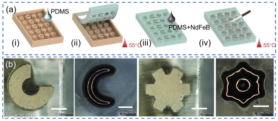 为了证明这种磁流体基机器人所具有的且刚性机器人所欠缺的实际应用能力,作者设计了几个验证实验:1.制造不同形状的永磁体并磁化,观察不同磁场下磁流体基机器人的变形情况;2. 打印不同形状的模块,测试磁流体机器人的搬运能力;3.打印狭缝,测试机器人穿越窄缝的性能。通过采用PμSL 3D打印技术(nanoArch S140,摩方精密),实现了验证实验中的搬运模块、永磁模具及狭缝的精密制造。