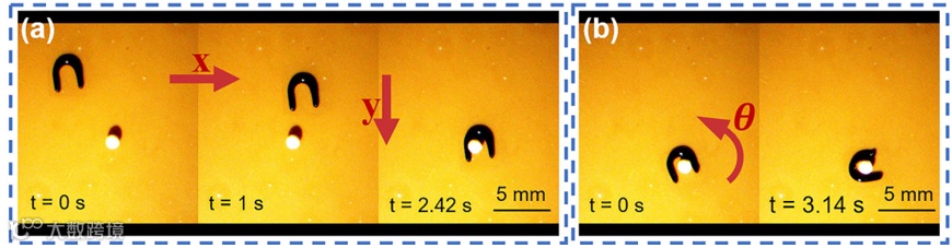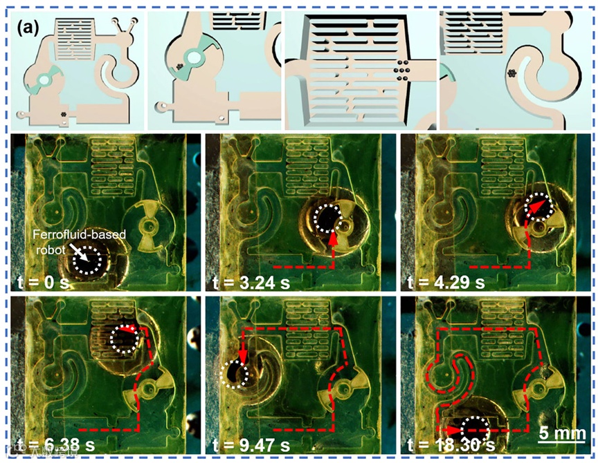 图4. 磁流体基机器人穿越狭缝动画及实物演示