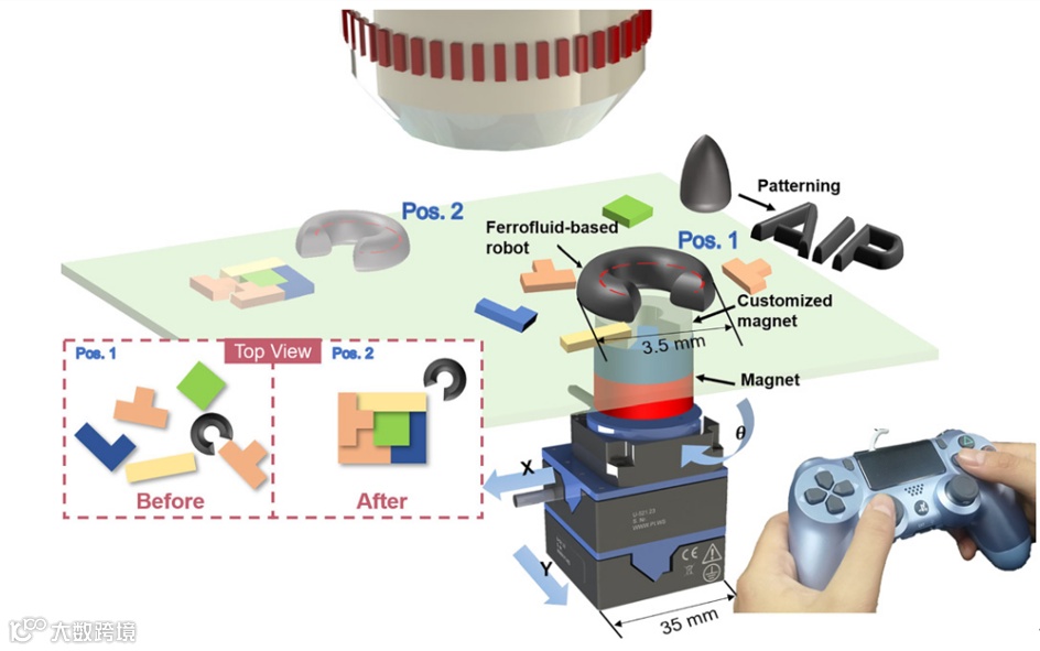 图1. 通过多种形状的永磁铁产生的集中磁场改变磁流体形状进而达到搬运不同模块的目的