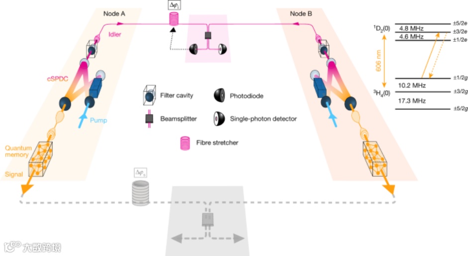 背靠背发表的另一篇论文,Telecom-heralded entanglement between multimode solid-state quantum memories(多模固态量子存储器之间在电信频率的预告纠缠),来自西班牙巴塞罗那光子科学研究所,他们选择了与中科大团队相似的实验设置并获得了相当的实验结果。研究人员使用两种可以产生波长为1436 nm(与光纤通信波长一致)和606 nm的光源,在两个相距10 m的量子存储器之间实现了量子纠缠,并且单光子在量子存储器中可以保持长达25 μs。