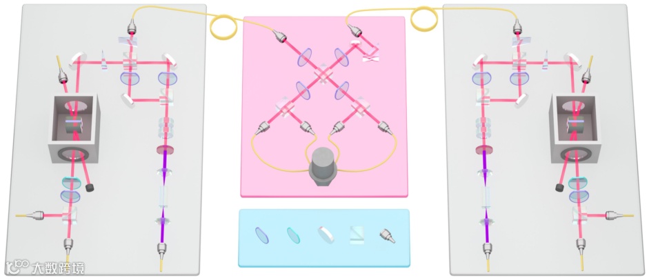 研究人员利用参量下转换技术制备了两套纠缠光源,同时开发了一种具有“三明治”结构的基于稀土离子掺杂晶体的固态量子存储器。每对纠缠光子中的一个光子存储于量子存储器中,另一个光子则被同时传输至中间站点进行贝尔态检验。这样一种将纠缠光源和量子存储器分离的架构,可以同时支持确定性光子发射和多模式复用存储,对于实现量子中继中的通信加速提供了可能。实验中贝尔态检验的过程也是纠缠交换的过程,即尽管两个量子存储器间没有任何直接相互作用,但是二者间依旧成功地建立起量子纠缠。
