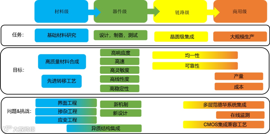 总的来讲,硅-二维材料光电探测器研究可分为材料级、器件级、链路级及商用级等几个层级,其发展还面临系列挑战: