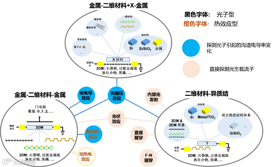 二维材料光电探测器工作机制非常丰富,本文对此进行了深入分析和总结,如下图所示。根据是否涉及到载流子或晶格温度的变化分为光子型和热效应型两大类。