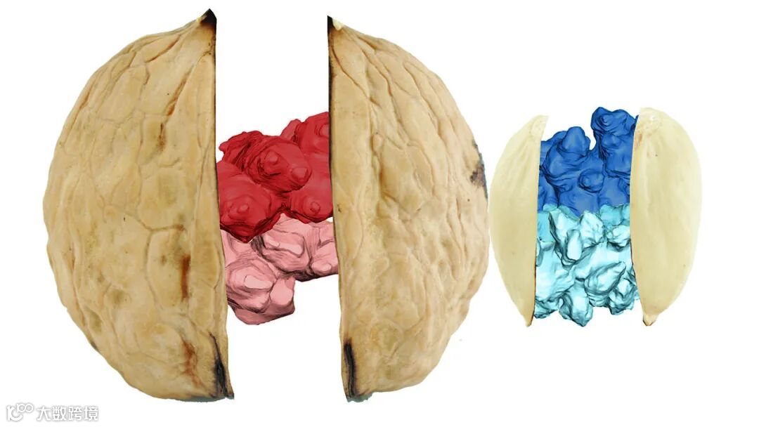该研究使用微型计算机断层扫描仪和电子显微镜、原子力显微镜和红外显微镜在纳米尺度上检查了核桃壳和开心果壳的碎片。研究发现,与核桃壳中的细胞一样,开心果壳中的互锁细胞与 14 个相邻的细胞相连。两个壳中的细胞也有坚韧的细胞壁,里面装满了螺旋状的微纤维线圈。但拉伸强度测试表明,开心果壳材料要强得多,这可能是因为它的细胞的裂片数量是核桃细胞的三倍,这使它们相互锁定的表面积增加了30%。与核桃细胞不同,开心果细胞通过球形关节结构连接,类似于人类髋关节,如 3D 动画(下图)所示。