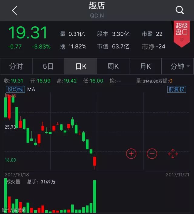 因有消息称互联网小贷牌照发放被紧急叫停,在美上市互金中概股集体走低,不过较早盘跌幅有所收窄。截至收盘,趣店跌3.83%,拍拍贷跌14.01%,信而富涨3.5%,和信贷涨1.7%,简朴科技(融360)跌10.7%,鲈乡小贷跌8.80%,诺亚财富涨1.73%。值得一提的是,趣店紧急宣布,公司将实施一项股票回购计划,在未来12个月内回购至多价值1亿美元的在外流通美国存托股票(ADS)。趣店称,公司将通过公开市场、私下协议以及通过股东收购等方式完成此项股票回购。而后趣店明显反弹,跌幅由盘前30%以上收窄到开盘后11%左右,最终收盘跌幅不足4%。