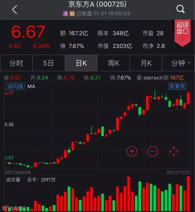 今年10月份以来,京东方A经历了一波快速上涨,累计涨幅达到了51.59%。随着京东方A在液晶面板和OLED屏幕领域实现弯道超车,今年前三季度业绩盈利64.76亿元,同比增长4503.51%,而股价方面也摆脱了长期的低迷,受到了投资者的认可。京东方A股东在此位置上开始有减持的动作,不知会产生何种影响。