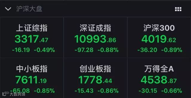而29日上午,两市小幅高开后一路走低。截至午间收盘,沪指下跌0.49%,再度回撤到3300点附近;深成指下跌0.88%;创业板指下跌0.86%。