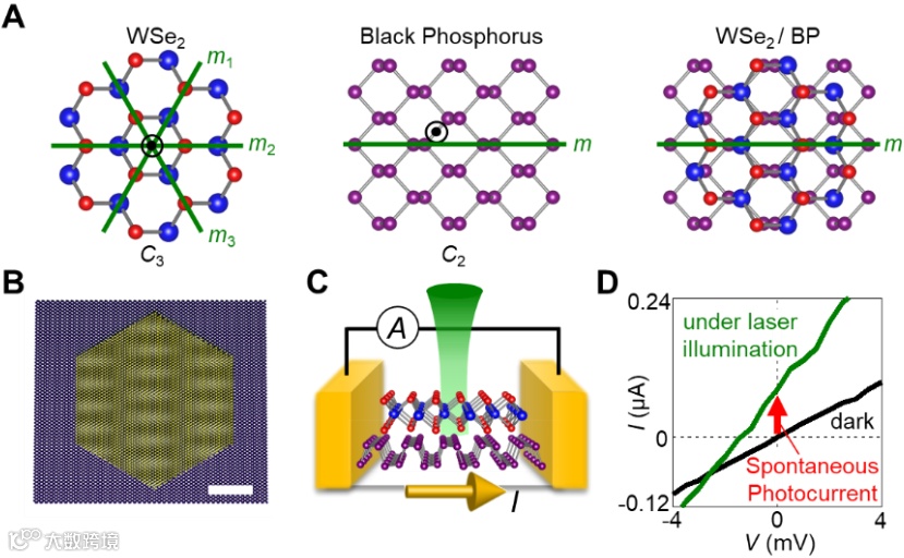 图1. (A)WSe2、BP和WSe2/BP范德华异质界面的晶体结构以及对称性;(B)WSe2/BP异质界面的莫尔条纹;(C)光电流测试示意图;(D)WSe2/BP器件的电流-电压特性曲线。在零偏压下测到的电流的光响应,即为自发光伏效应光电流。