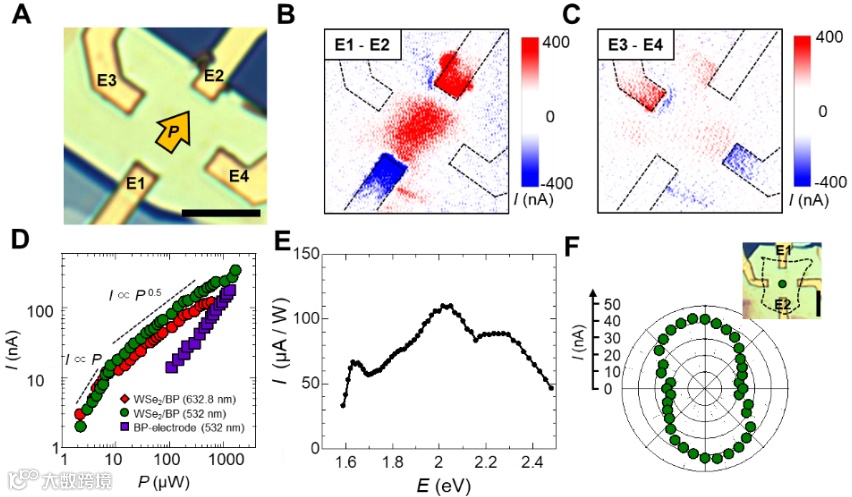 图3.(A)WSe2/BP范德华异质界面的光学照片;(B-C)E1-E2电极和E3-E4电极的自发光伏效应光电流空间分布;(D)自发光伏效应光电流的激光功率依赖性,其中两段不同指数的规律正是自发光伏效应的特点;(E)自发光伏效应中光电流的对激发光子的能量依赖性,说明光电流主要来自WSe2的贡献;(F)自发光伏效应中光电流对激光偏振方向的依赖性。