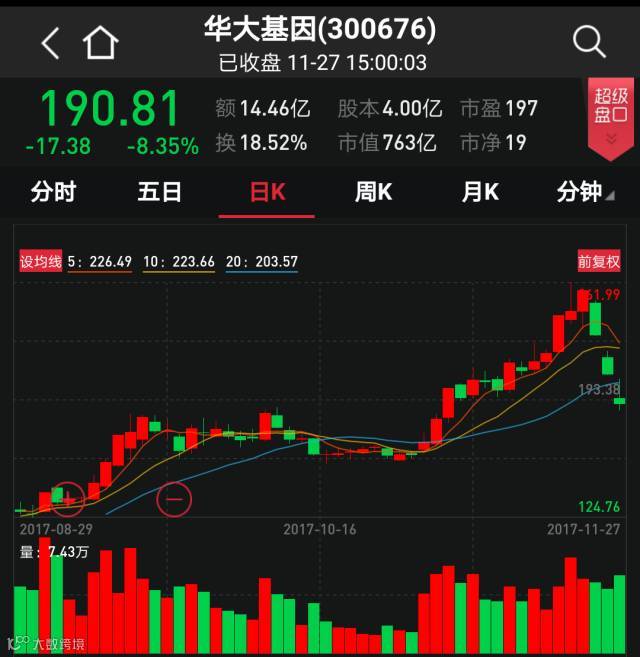 公司股价11月23日及24日均跌停,27日大跌8.35%,三日累计跌幅接近26%。有意思的是,大跌之前,公司刚刚因为“股票价格涨幅较大停牌核查”。作为基因测序龙头,华大基因自7月14日上市以来,股价一路狂奔,屡屡突破机构预测价位。11月14日公司股价盘中最高攀升至261.99元,总市值突破1000亿元大关。华大基因到底值多少钱,应该没有人能够说清楚,买或者卖,就看你是个什么样的投资者。