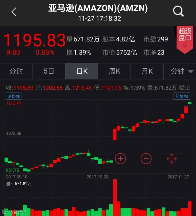 “黑色星期五”和感恩节销售的初步报告预示着假日购物季的良好开始。周一盘中,亚马逊(AMZN)股价有史以来首次突破1200美元,最终收于1195.83美元,收盘涨幅为0.83%。