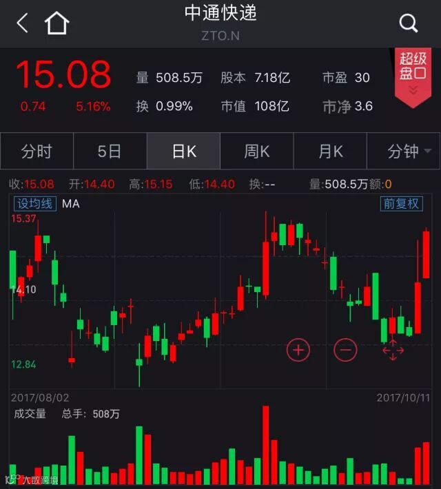 10月10日,中通快递宣布,今年以来,快递业受运输成本增加、人工成本提升、原材料价格上涨等多种因素影响,同时为了进一步提升服务质量,保障客户利益,中通快递集团经综合考虑,决定从即日起调整快递价格,具体情况请咨询当地服务网点。宣布提价后,中通快递股价大涨5.6%,市值一天增加了5.45亿美元(约合人民币35.87亿元)。周三,中通快递股价继续上涨,最终上涨5.16%,报收15.08美元。
