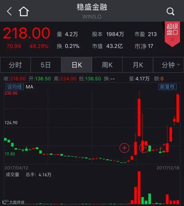 周一,中国概念股多数上涨,阿里巴巴收跌0.1%报173.37美元,百度收涨3.19%报240.93美元,京东收涨3.37%报41.68美元,唯品会收涨39.22%报11.75美元,微博收涨5.13%报107.99美元,搜房网收涨4.81%报4.58美元,简普科技收跌10.67%报6.70美元,迅雷收跌7.67%报14.56美元,拍拍贷收跌3.33%报7.26美元。此外,曾大涨4500%的“妖股”稳盛金融,收盘暴涨48.29%,报218.00美元/股,与上周一48.01美元/股的收盘价相比,近一周时间内股价已翻了逾4倍。