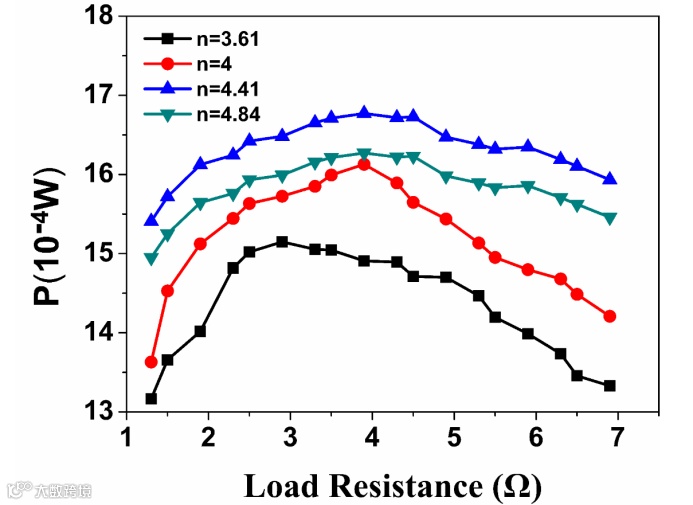 光伏热电复合系统的发电效率不仅受太阳光聚光比、系统工作时温度、外接负载大小等因素影响,光伏电池与热电器件的结构参数也会显著影响混合系统的输出性能。为了研究这一参数的具体影响,新技术实验室新能源材料与设备团队研究人员选取单晶硅、砷化镓太阳能电池和不同尺寸的热电器件进行了研究。在不同光伏电池与热电器件面积比值(n值)下,热电器件输出功率会产生明显的差异。经过分析得出,当二者面积比为4时,系统中的热电器件可以实现最大的功率输出。在光伏电池和热电器件输出的电能相互隔离的情况下,由砷化镓电池和热电器件组成的混合系统的综合发电效率最高可达到32.2%(如图2所示)。