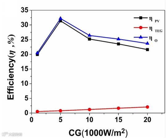 图2 混合系统效率与光伏、热电单个组件效率的对比
