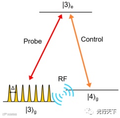 存储方案示意图,信号光场(probe)被梳状的原子吸收谱吸收,并被控制光场(control)存储为自旋激发,在射频(RF)场的操控下延长存储时间,最终读取为光信号。