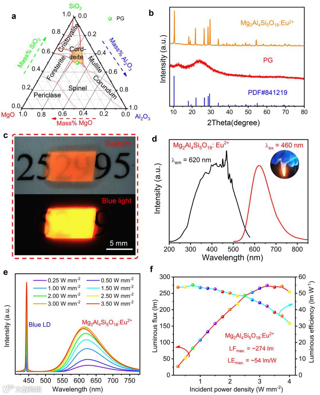 以MgO-Al2O3-SiO2三元相图为参考设计了前驱玻璃体,并采用热处理方式诱导玻璃结构弛豫和晶化,制备得到了高度结晶的Mg2Al4Si5O18:Eu2+微晶玻璃。研究表明,Eu2+离子富集于Mg2Al4Si5O18晶相六配位环境,从而赋予了Eu2+离子强晶体场环境,使得该材料表现出450 nm蓝光激发,620 nm红光发射特性。