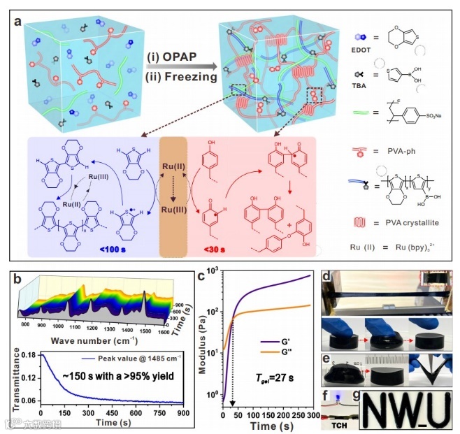 近日,来自西北大学化学与材料科学学院、教育部合成与天然功能分子化学重点实验室的Hongqiu Wei等人报道了一种正交光化学辅助打印(OPAP)策略,通过合理的可见光化学设计和可靠的挤压打印技术的结合,在一个锅中制造三维TCHs。这种正交化学快速、可控,同时实现了EDOT光聚合和苯酚偶联反应,导致在短时间内(tgel~30 s)构建出坚韧的水凝胶。由此制备的TCHs具有韧性、导电性、可拉伸性和抗冻性。这种无模板3D打印可以在制造过程中加工成任意的结构。为了进一步证明这种简单的OPAP策略和TCHs的优点,3D打印的TCHs水凝胶阵列和螺旋线,用于组装高性能压力传感器和温度响应致动器。预计这种一锅快速、可控的OPAP策略将为制造坚韧的水凝胶打开新的视野。相关研究工作发表在《Nature Communications》上。(詹若男)