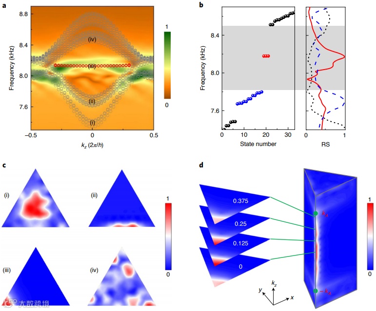 在这项工作中,研究人员首先从模型设计上创新:通过堆垛二维笼目三角晶格以形成三维结构,并引入具有三重旋转对称性的双螺旋层间耦合,从而使体能带产生外尔点简并,基于此即可在晶体侧面的棱上产生拓扑非平庸的一维铰链态。这种具有双螺旋层间耦合的笼目晶格堆垛模型非常巧妙地解除了以往理论模型的苛刻要求以及在实验上的困难。在此基础上,利用3D打印技术制备了相应的声子晶体样品,通过测量体态、面态和棱态的色散关系及声压场分布,证实了这种设计确实是具有铰链态的高阶拓扑半金属。由于体系外尔点属于第一种类型,且拓扑荷反号的外尔点居相同频率,所以该高阶拓扑半金属为I类理想外尔半金属,这为研究高阶拓扑半金属的性质带来了极大方便。