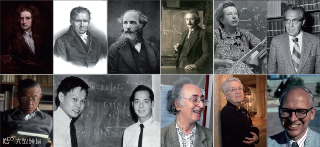理论背后的大师。上排:牛顿,泊松,麦克斯韦,爱因斯坦,梅耶夫人,施温格;下排:霍伊尔,杨振宁和李政道,约瑟夫森,鲁宾,福特