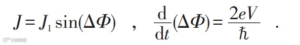 其中,J1 是绝缘结的参数(临界电流),而 J 是无耗散的电流。Φ 是势垒两侧的库珀对波函数的相位差,e 是电子的电荷,V 是两个超导体的电势差。