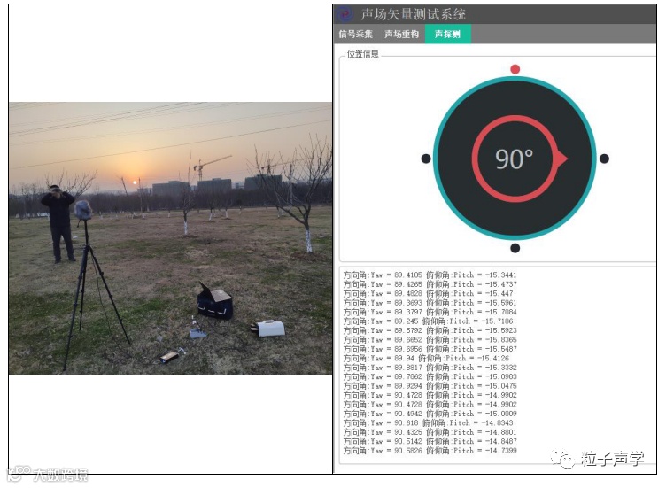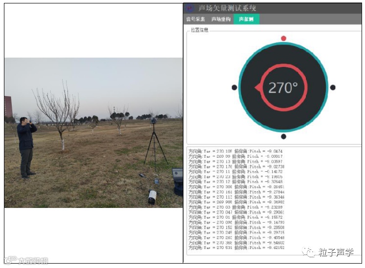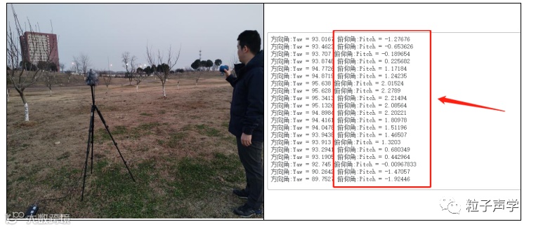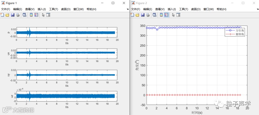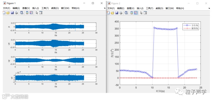 下面给出了室内环境下单个三维矢量传声器的定向测试,其中声源位置固定,通过分段截取接收信号进行方位角和俯仰角估计,可以看到定向结果非常稳定。