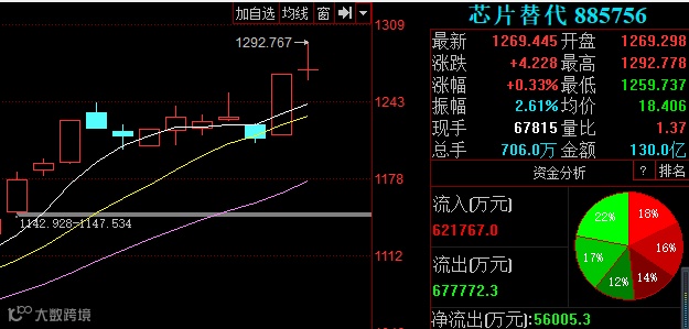 其实A股本轮芯片概念股普涨,已经持续了一段时间。9月3日,华为发布全球首款移动AI芯片,是业界首颗带有独立NPU专用硬件处理单元的手机芯片,标志着人工智能从云端走向终端,就此激起了A股芯片股做多热情。9月3日至今,本轮芯片龙头股科大国创累计涨幅已有64.05%,国科微涨幅也达到了47.61%,士兰微、兆易创新等一批芯片概念股涨幅也超过了10%,此时正逢股指调整之际,板块整体冲高回落的表现也就不足为奇了。