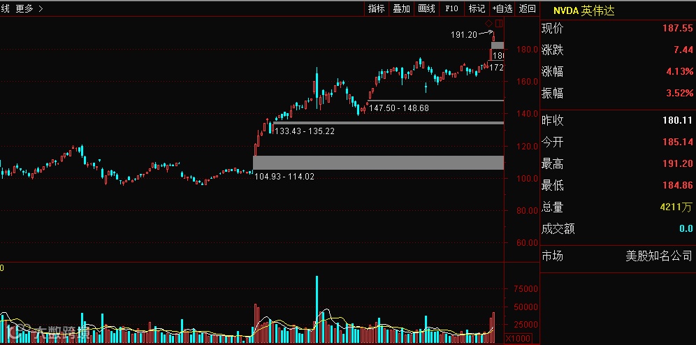 英伟达在本周一的美股市场吸睛无数,收涨4.13%,报187.55美元,周一盘中触及52周新高点191.20美元,连续第二日创下历史新高。英伟达股价在过去一年里暴涨了187%,同期标普500指数上涨17%,而自2016年以来,英伟达股价累计涨幅竟然逾450%。