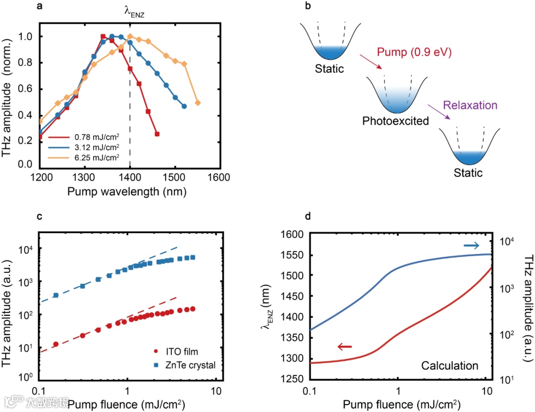 进一步探究ENZ效应对太赫兹波辐射的增强原理,作者测量了太赫兹波强度随泵浦波长的变化关系,发现在ENZ波长附近太赫兹波辐射得到明显增强。同时作者发现了一个有趣的现象,其峰值波长会随泵浦能量密度改变而发生偏移。针对该现象作者建立了热电子模型进行定量计算,理论计算与实验结果符合较好。作者还进行了功率相关性测量,进一步验证太赫兹波的产生过程为二阶非线性过程。
