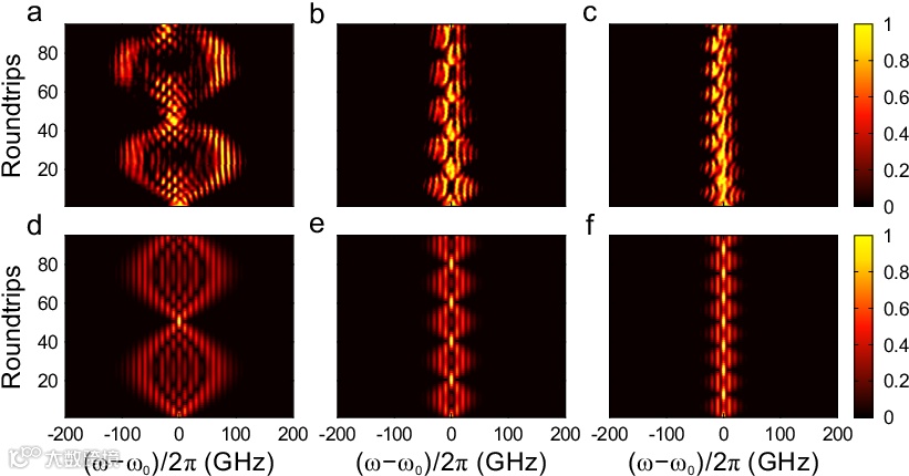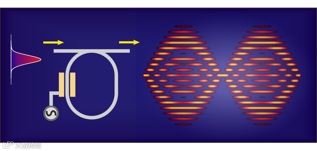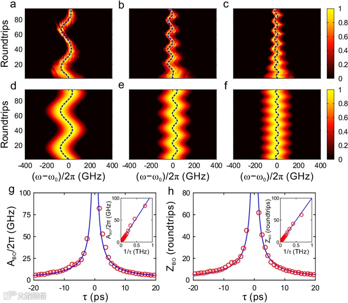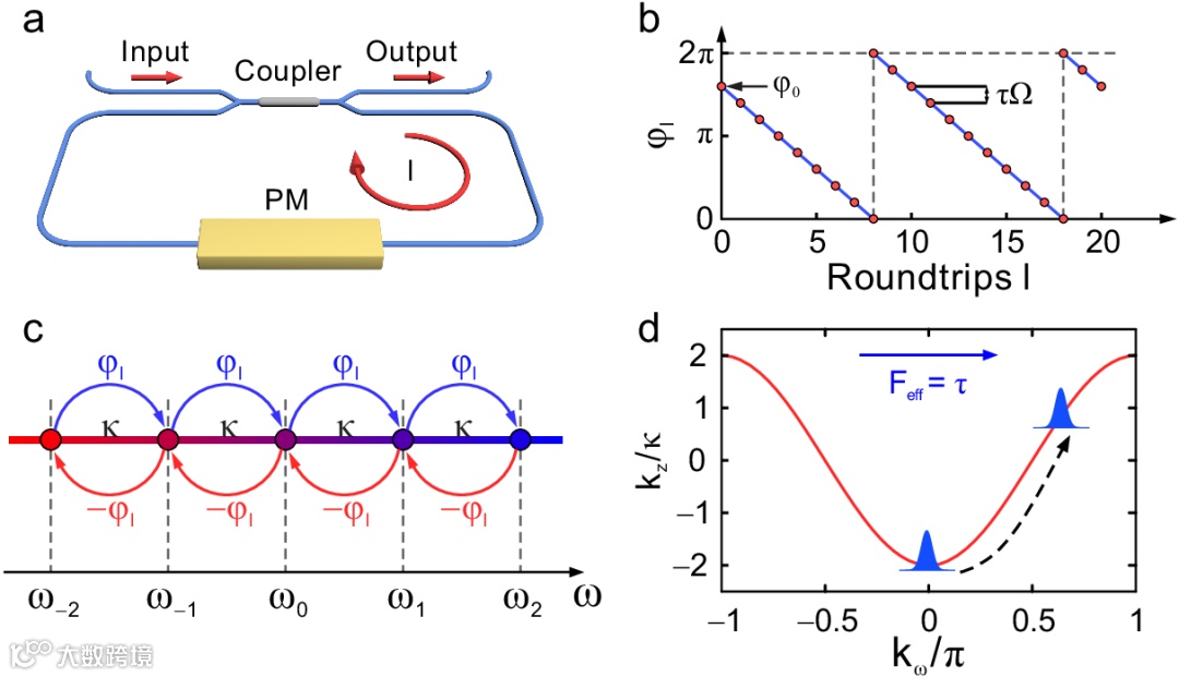在本研究中,研究团队利用光纤环路和相位调制从实验上实时观测到了频率的布洛赫振荡。借助电光相位调制,在光纤中产生等频率间隔且能相互耦合的模式,形成周期频率晶格,晶格常数为调制信号频率。当入射光在环路中一圈的光程与调制信号周期之间存在小的时间失谐量时,使入射光每经过调制器时调制信号的相位发生改变,继而影响光信号频谱的演化。此时,时间失谐量起到了频率维度中的等效电场力的作用,使频率模式的波矢随循环圈数线性变化。结合周期的色散关系,使得光子频率随循环圈数发生周期性变化,该现象即为频率布洛赫振荡。