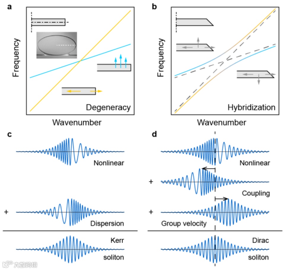 图1 模式杂化和狄拉克孤子原理图。a左上角的插图是一个谐振腔的横截面图,谐振腔内具有相同波数的TE和TM模式可能偶然地发生简并,下面的两幅插图分别表示TE和TM模式的电场方向。b 对于一个非对称的谐振腔横截面(左上角插图),简并被打开,避免了交叉。左右插图表示杂化电场的方向。c 克尔孤子的平衡非线性和色散效应。d 狄拉克孤子的平衡非线性,耦合和群速度差效应。