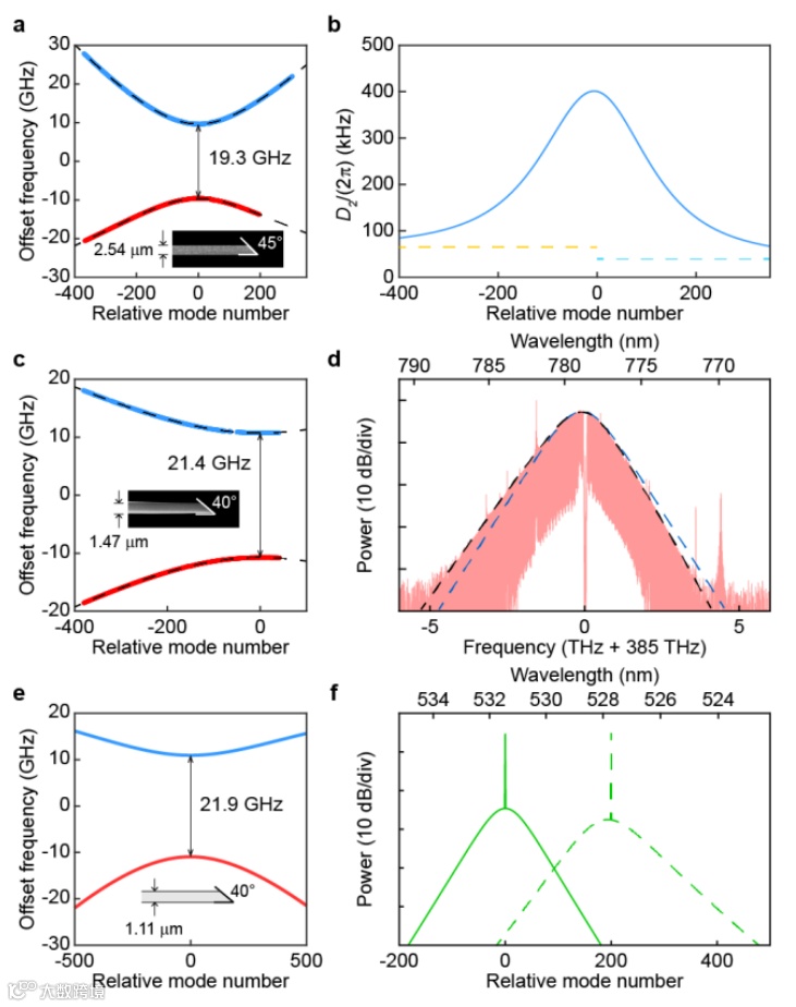 模式耦合是在微谐振腔中形成光孤子的一个重要特征,其中不同的模式族要经历类似能级交叉的频率简并,如图1a所示。这种交叉使光孤子光谱包络具有结构(图1 c,d),这会引起一系列有趣的微频率梳现象:色散波辐射,暗孤子形成、泵浦噪声隔离、提高的泵浦效率、和近可见频段辐射的色散控制。