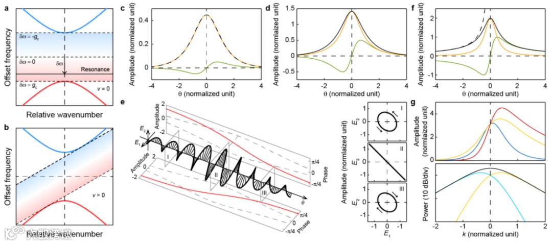 图2 微谐振腔中狄拉克孤子的封闭解。a 混合模式两个分支的共振图示。b 在任意固定的正重复频率位移下孤子共振的范围。c,d,f 狄拉克孤子电场的实部与虚部,黑色虚线是对应克尔孤子的比较。e 狄拉克孤子的偏振旋转。g 狄拉克孤子电场的频域振幅和功率分布。