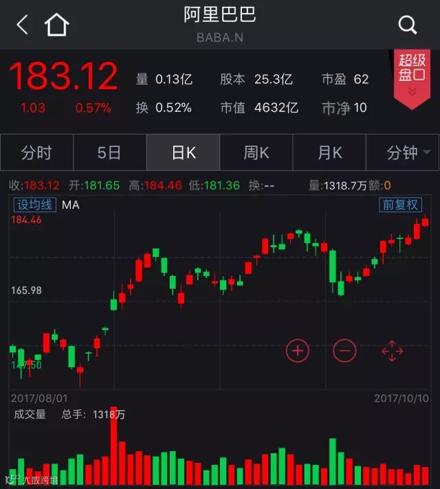 盘中,阿里巴巴股价涨逾1%,市值超过4700亿美元,超越亚马逊成为全球市值最高的电商平台。其后阿里涨幅收窄,收涨0.57%,报183.12美元,连续第二个交易日创收盘新高。