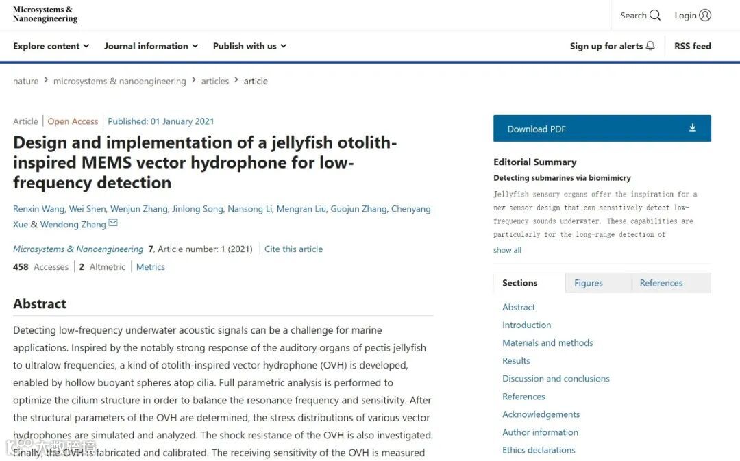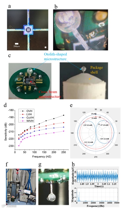 近日,受水母听石结构对超低频声信号响应灵敏的启发,中北大学王任鑫副教授、张文栋教授课题组开发了一种新颖的压阻式仿生矢量水听器(OVH),其核心敏感结构为顶端集成空心球体的仿生纤毛(密闭中空球外径1mm,内径530μm,直杆粗350μm,高3.5mm),基于摩方精密PμSL 3D打印技术(nanoArch P130,光学精度2μm)制备而成。OVH接收灵敏度达-202.1 dB@100 Hz(0 dB@1 V/μPa),工作频带为20-200Hz,OVH的平均等效声压灵敏度达到-173.8 dB,能耐10 MPa静水压力,显示出OVH在低频水声探测的应用潜力。该成果以“Design and implementation of a jellyfish otolith-inspired MEMS vector hydrophone for low-frequency detection”为题发表在Microsystems & Nanoengineering上。