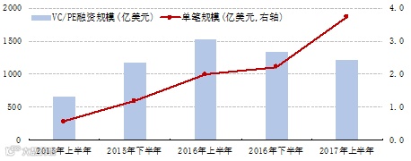 根据投中的半年度统计,中国创业投资与私募股权(VC/PE)基金的募集规模从2016年下半年起连续下降,单笔募集规模的平均值则不断创出新高(图2)。2017年上半年,基金募集完成额总计1218亿美元,新基金募集的目标规模则突然跃升至2823亿美元。按照同期美元兑人民币汇率中间价的平均值6.85计算,上述两个规模指标分别大约折合0.8和1.9万亿元人民币。