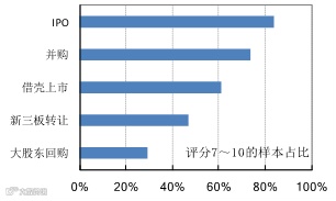 根据调查机构的主观评判,2017年具有明显选择倾向的前两个退出渠道是IPO和并购(图6)。在预先设定退出渠道名单的情况下,借壳上市也受到了较高的关注,高打分区间7~10的样本占比为61%。新三板转让受到的青睐度已经不比往年。新三板转让明显逊色于沪深两市的IPO也是一个客观事实。这种显然的主次关系与机构的自信倾向可能会更大地拉开打分差距。同样,大股东回购在大样本统计中较为多见,但很难得到机构主观上的积极回应。它是最常见的保底条款,一种不及预期时的无奈之举,只有少数情况下作为一种特别安排。