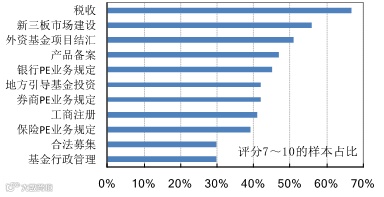 在关于私募股权行业政策环境的评判中,65%的机构认为2016年间中国私募股权行业相关政策有利于行业规范发展,认为干预过多的机构占比24%。为促进私募股权行业的健康发展,调查问卷中列举的需要调整和改进的政策选项基本上都受到了重视(图3)。前三类政策最受关注(量化打分在7-10区间)。第一是“税收”,认为较为重要的机构占比67%。它事关投资者的回报分配。这里虽然没有说明具体的税收因素及制约,但其重要性显而易见。尤其当投资项目的生存概率下降时,多层纳税与亏损项目涉税会带来较大压力。第二是“新三板市场建设”,持重要观点者占比56%。这一点事关投资项目的退出渠道,也间接影响到投资回报。第三是“外汇项目基金结汇”,持重要观点者占比51%。这一点反映出近三年多来国内私募股权行业快速发展以及企业加速海外布局时遭遇外汇管制所引发的矛盾冲突。当前的外汇管理政策有利于宏观形势的稳定。对私募股权基金而言,在一定程度上增加了外币资金募集、海外投资、国内企业开发海外市场机会等的难度和交易成本。