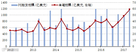 自2016年下半年以来,一些巨无霸基金陆续登上舞台也格外引人注目。例如目标1千亿美元的软银愿景基金(Softbank Vision Fund)、目标400亿美元的黑石基础设施I期基金、目标3500亿人民币(约折合500亿美元)的中国国有企业结构调整基金、目标2000亿人民币(约折合290亿美元)的中国国有资本风险投资基金等。2017年第二季度,已经封闭的PE基金的季度平均单只融资规模接近6亿美元,相当于2012-2014年间平均水平的两倍,且过半的基金募集额度超过当初目标。单笔规模的上升反映出私募股权行业的集中度在提高。最近三年多来,大型机构在融资活动中的市场份额不断上升。