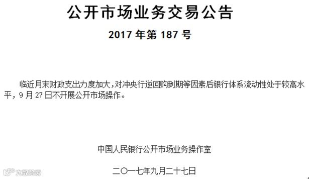 我们来看看9月27日上午,央行公开市场交易公告是怎么说的。