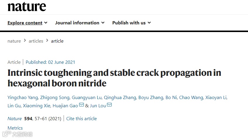 近日,来自美国莱斯大学楼峻教授和新加坡南洋理工大学高华健院士(美国科学院院士、美国工程院院士、美国艺术与科学院院士、德国科学院院士、中国科学院外籍院士、欧洲科学院院士)的联合团队在《Nature》发文称,他们发现:常识中认为脆性的h-BN居然表现出超强的抗裂性(即韧性),是石墨烯的10倍!这个发现与格里菲斯的断裂理论背道而驰,而且此前从未在二维材料中观察到这种异常现象。相关研究成果以“Intrinsic toughening and stable crack propagation in hexagonal boron nitride”为题,发表在国际顶级期刊《Nature》上!