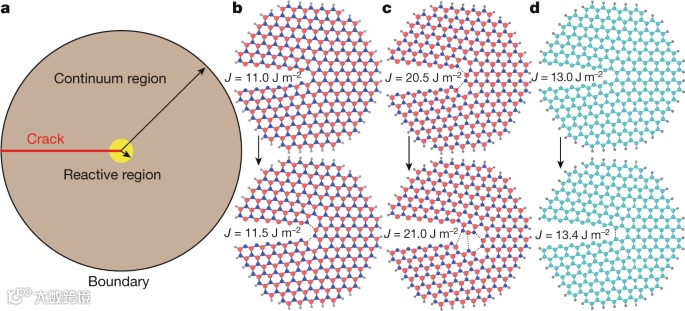 虽然石墨烯和h-BN结构上可能相似,但硼和氮原子不一样,所以在h-BN中的六方晶格本征存在不对称排列,与石墨烯中的碳六边形不同。简单来说,在石墨烯中,裂纹倾向于从上到下直线穿过对称的六边形结构,像拉链一样打开粘合。由于硼和氮之间的应力对比,h-BN 的六边形结构略有不对称,这种晶格的固有不对称性会导致裂纹分叉,形成分支。
