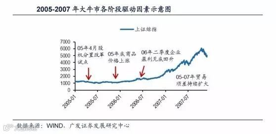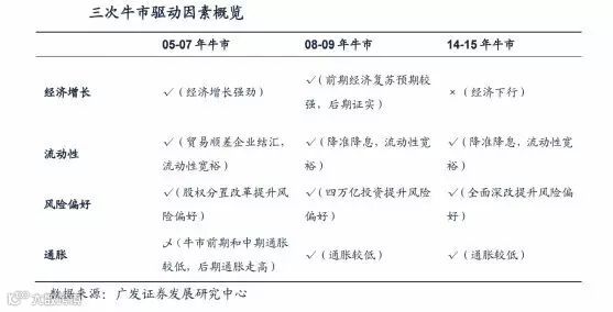复盘A股最近十年的三轮牛熊变换,总也避不开经济增长、流动性、风险偏好和通胀四个不变的驱动因素。根据广发证券的回顾总结,2005-2007年、2008-2009年、2014-2015年三轮牛市有着共同特点,即四大因素中至少三因素发生共振,才会开启一轮大牛市。