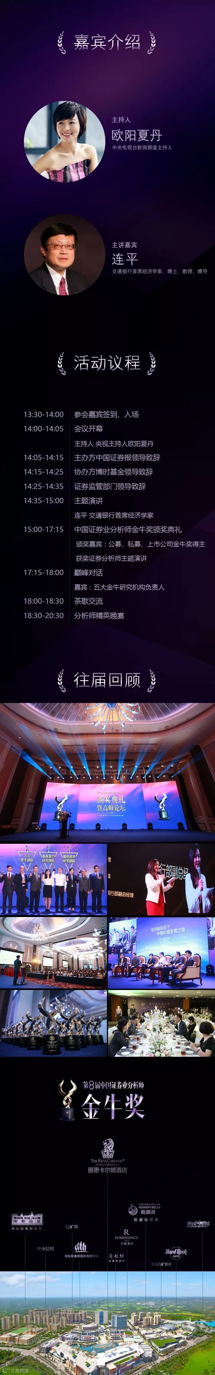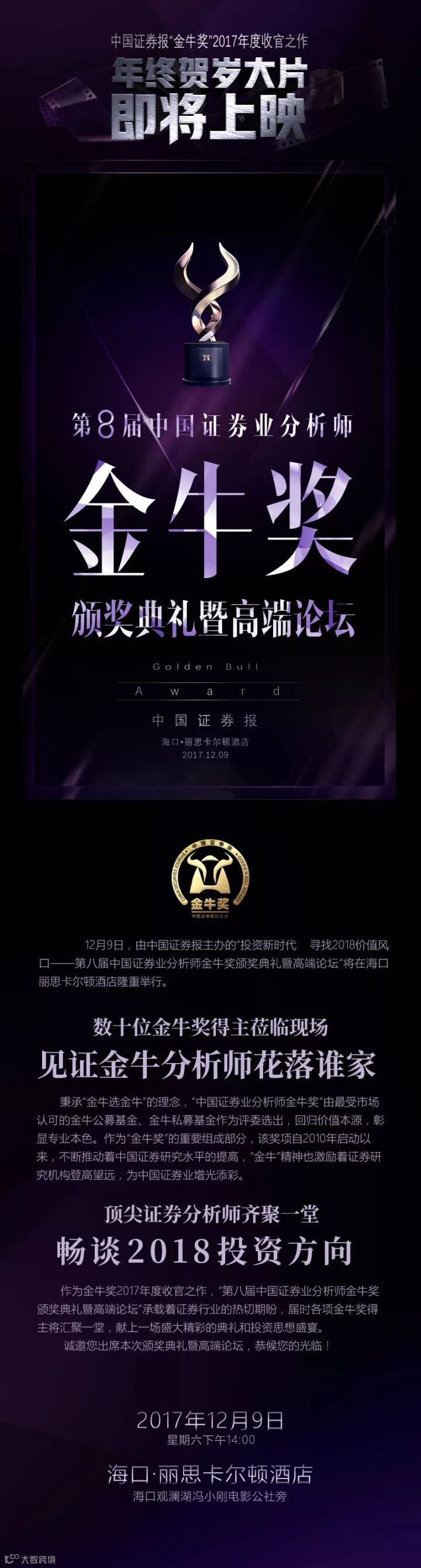 作为“金牛奖”2017年度贺岁大片,“投资新时代 寻找2018价值风口——第八届中国证券业分析师金牛奖颁奖典礼暨高端论坛” 将于12月9日在海口丽思卡尔顿酒店隆重举行。中国最优秀的证券分析师和研究机构将获取殊荣,与资本市场各路精英汇聚一堂,共同探讨新时代的投资方向。