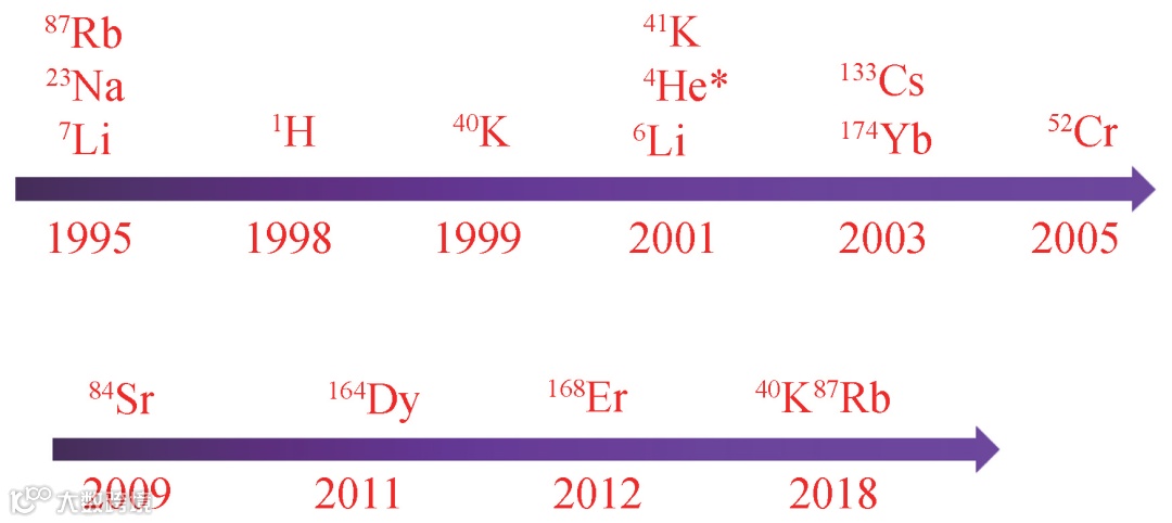 另一方面,独立于这些极化氢原子的工作,激光冷却的概念被提出来[5,6],并在碱金属原子上获得成功。激光冷却能够获得极低的温度,由此人们意识到,可以进一步冷却从而实现BEC。于是众多小组开展了BEC的研究工作,竞争激烈。最终1995年,美国科罗拉多大学JILA的 Carl Wieman 和 Eric Cornell 小组率先实现了87Rb的BEC[7],不久后麻省理工学院的 Wolfgang Ketterle小组实现了Na的BEC[8]。而之前研究了很长时间的H原子在1998年实现了BEC[9]。至于JILA小组为什么选择 Rb 作为工作原子,部分原因是因为87Rb激光冷却的跃迁波长是 780 nm,有比较便宜的半导体激光器。但后来证明,87Rb是最容易实现BEC的原子,其碰撞性质非常友好,也是目前冷原子物理中用得最多的原子种类。随后,越来越多的原子种类被制备到量子简并状态。比如1997年JILA的 Deborah Jin 小组实现费米气体(40K)的量子简并态[10]。目前而言,所有的稳定碱金属原子(Li,Na,K,Rb,Cs)及其同位素都实现了量子简并态,一些碱土原子(Sr)和稀土原子(Cr,Dy,Er) 也实现了量子简并态,最新的进展是基态分子也实现了量子简并态(KRb)。图1列出了一些重要元素实现量子简并气体状态的时间表。这一系列的工作也代表了超冷原子物理研究人员不懈的努力。