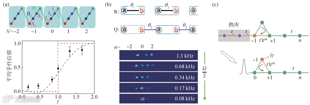 图4 动量空间合成维度量子模拟 (a)拓展的SSH模型研究。构造更高内部维度的SSH模型,并观测其相变;(b)通过切换奇偶耦合的方法实现动量空间量子行走;(c)通过一个热库构造了一个等效的耗散A—B环结构,实现超冷原子在动量空间的非对易传输