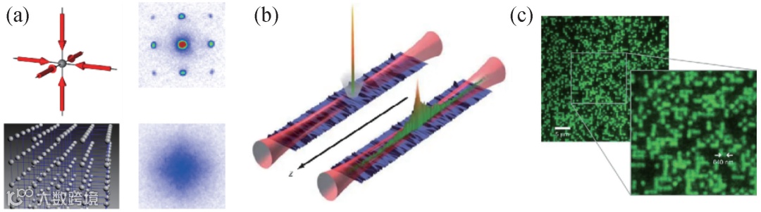 图2 一些重要的光晶格实验 (a)利用驻波场实现光晶格结构。右边两张图是超流相和 Mott 绝缘相在自由飞行后的照片[12];(b)超冷原子的 Anderson 局域化实验[14]。在光晶格中引入无序的杂质,观测到原子的演化被局域化了;(c)光晶格中的高分辨成像照片[16],每一个亮点代表这个晶格内有原子